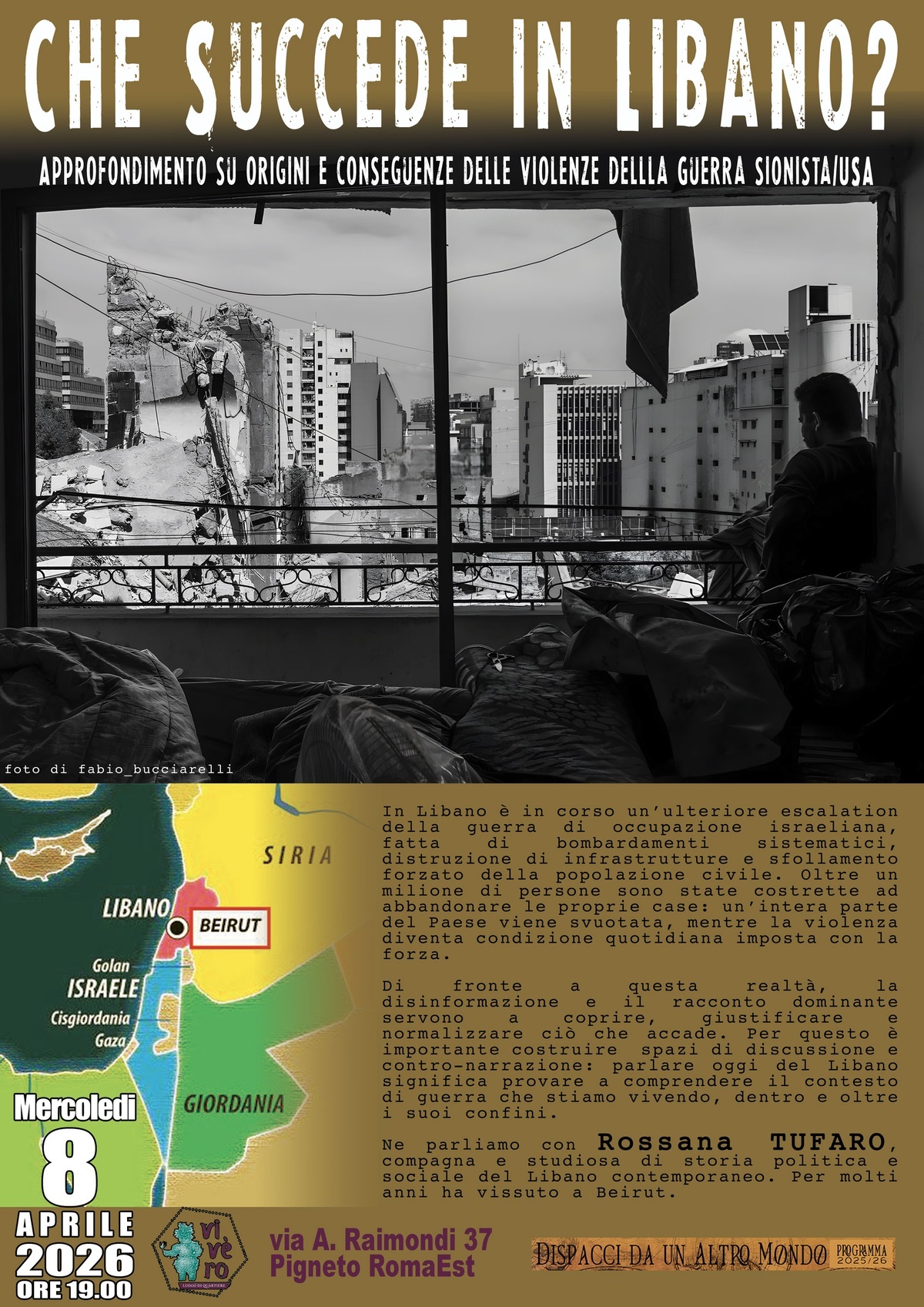 Di fronte a questa realtà, la disinformazione e il racconto dominante servono a coprire, giustificare e normalizzare ciò che accade. Per questo è importante costruire spazi di discussione e contro-narrazione: parlare oggi del Libano significa provare a comprendere il contesto di guerra che stiamo vivendo, dentro e oltre i suoi confini.
