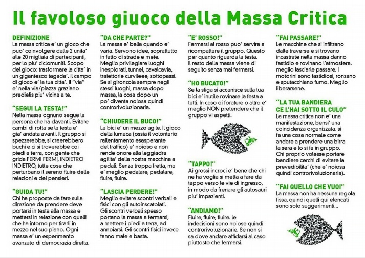 Non essere sessista, autoritario e molesto. In generale non diventare un accollo per chi ti sta intorno. La critical Mass deve poter essere un luogo spensierato e il più sicuro possibile per chi la attraversa.