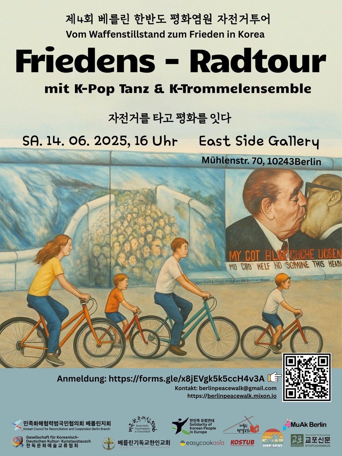 Die vierte Friedens-Fahrradtour beginnt am Samstag, den 14. Juni, an der East Side Gallery in Berlin und führt über die Botschaften von Südkorea und Nordkorea bis zum Potsdamer Platz.