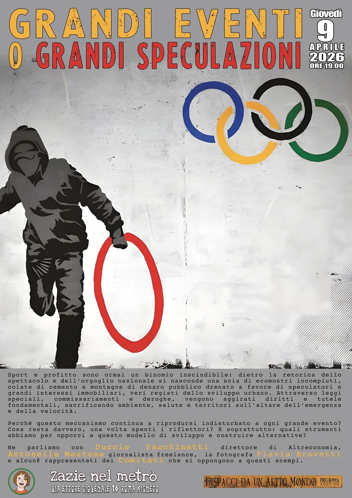 Perché questo meccanismo continua a riprodursi indisturbato a ogni grande evento? Cosa resta davvero, una volta spenti i riflettori? E soprattutto: quali strumenti abbiamo per opporci a questo modello di sviluppo e costruire alternative? Ne parliamo con Duccio Facchinetti direttore di Altreconomia, Antonella Mautone giornalista freelance, la fotografa Flavia Bravetti e alcun@ rappresentati dei Comitati che si oppongono a questi scempi.