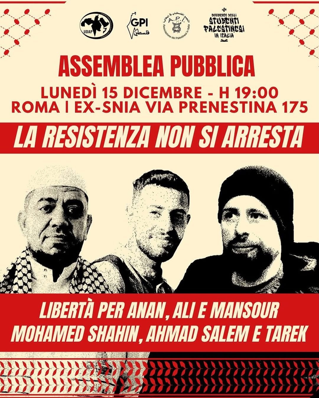 Fondamentale è legare la vicenda di Anan, Ali e Mansour a quella degli altri prigionieri in Italia, ovvero Shahin, Tarek e Ahmad. Questi processi e queste detenzioni fanno parte di un disegno repressivo più ampio, dentro cui rientrano anche i DDL Gasparri, Delrio e Fassino, finalizzato a criminalizzare la Palestina e la sua resistenza.