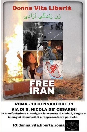 Per queste ragioni, vi invitiamo a unirvi a noi nella manifestazione che si terrà a Roma il prossimo 18 gennaio. In questo momento storico ribadiamo con forza il diritto del popolo iraniano all’autodeterminazione: il destino politico dell’Iran deve appartenere esclusivamente al popolo, libero da ogni ingerenza o manipolazione.