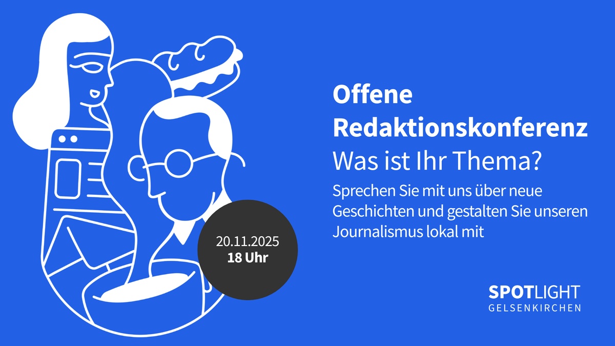 Am 20. November laden wir Sie herzlich in unser Café ein, um in offener Runde darüber zu sprechen, was die nächsten Geschichten für Spotlight Gelsenkirchen sein sollten. Worüber sollten wir im kommenden Jahr unbedingt berichten? Wie können wir für Sie noch relevanter werden? Außerdem freuen wir uns über ehrliches Feedback zu unserer Arbeit in den vergangenen Monaten.