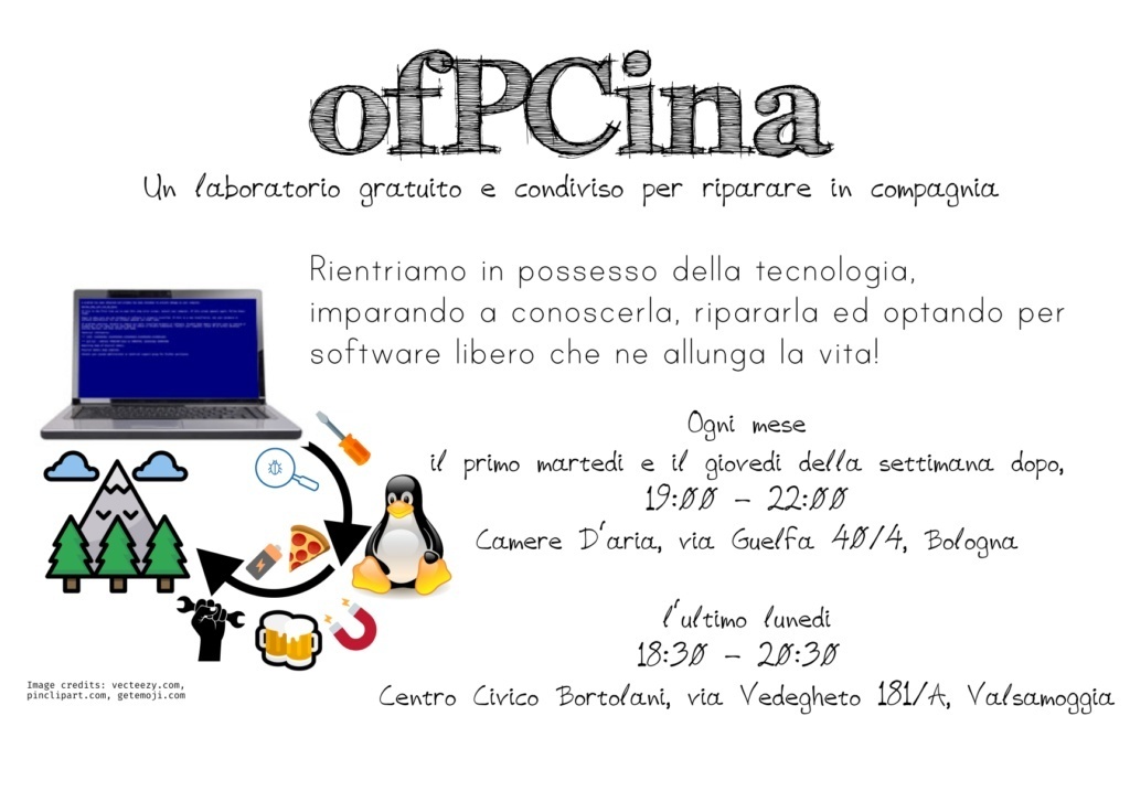 PSSS.. sei una informatica, un tecnico elettrotecnico o semplicemente un ciappinatore? Valuta di unirti al gruppo di ofpcina. Siamo volontari, ripariamo in compagnia perché crediamo nel valore umano del fare le cose insieme e del condividere saperi. Inoltre siamo già nerd nella vita, quindi tre appuntamenti al mese dove fare da facilitatori tra le macchine e gli altri nostri amici, non è male! Inizialmente avevamo il problema che molte amiche ed amci ci chiedevano di riparargli le cose, senza darci feedback adeguato e senza spiegare abbastanza bene quale era il guasto.. ci dava fastidio che le macchine venissero guardate come dei “segreti inaccessibili” quindi abbiamo fondato ofpcina per trovare un momento comune dove insegnare alle persone come fare diagnostica sul computer, mentre potevamo farci un aperitivo chiacchierando di cose tecniche! ed eccoci qua