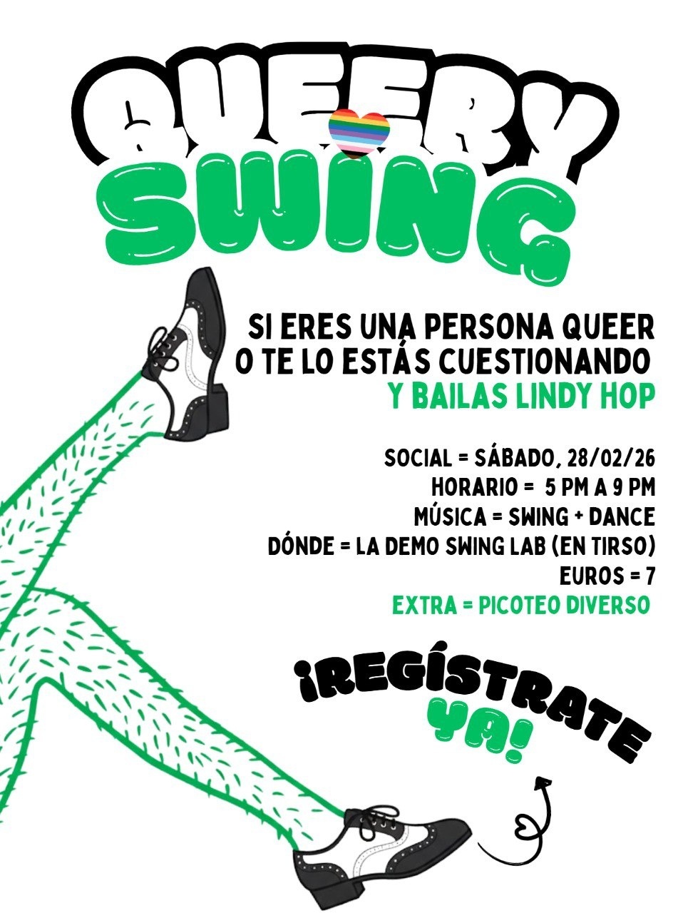 Somos La Fauna Queer, un grupo de amigues de Madrid. Con mucha ilusión presentamos este social, dirigido a gente LGTBIQA+ y a personas en cuestionamiento que bailen lindy hop u otros bailes de la música swing. Será el 28 de febrero en la sala de LaDemo Swing Lab en Tirso de Molina de 17 a 21h. Pincharemos música swing y un ratito de disco. También habrá algo de picoteo.