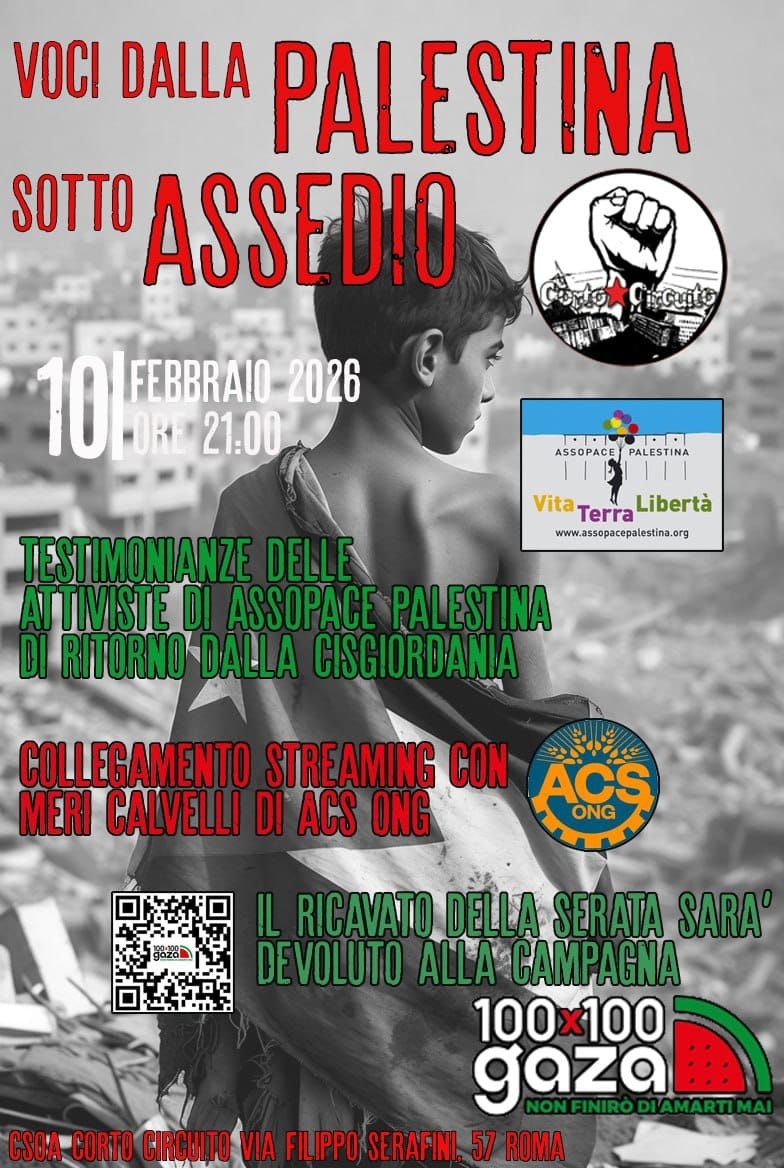Di fronte al genocidio in corso contro il popolo palestinese – con oltre 71.000 morti a Gaza, distruzione sistematica e condizioni di vita calcolate per provocarne la distruzione fisica, come accertato dalla Commissione d’inchiesta ONU e dalla Corte Internazionale di Giustizia – accogliamo con urgenza e sdegno le testimonianze dirette delle Volontarie di Assopace Palestina da poco rientrate dalla Cisgiordania ci racconteranno la loro esperienza tra i Comitati Popolari della Valle del Giordano, di Nablus, Hebron, Ramallah, Jenin, Masafer Yatta, AIDA Camp di Betlemme, attraverso filmati e immagini, e illustreranno la campagna Faz3a di invito e coordinamento di volontari per la Cisgiordania.