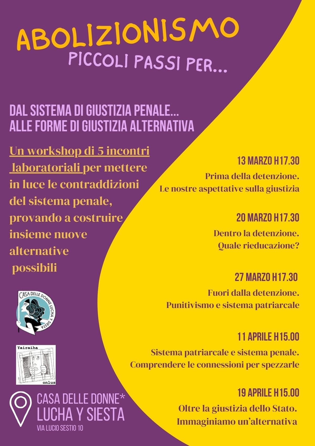 I singoli incontri sono pensati per costruire un percorso che, a partire dalle aspettative che abbiamo nei confronti della giustizia, metta in luce le contraddizioni del sistema penale su un piano sia quotidiano, sia strutturale. Attraverso un lavoro di decostruzione risaliremo alle radici patriarcali del sistema di giustizia attuale, provando a gettare le basi per costruire insieme forme di giustizia che non replichino le stesse dinamiche d’oppressione.